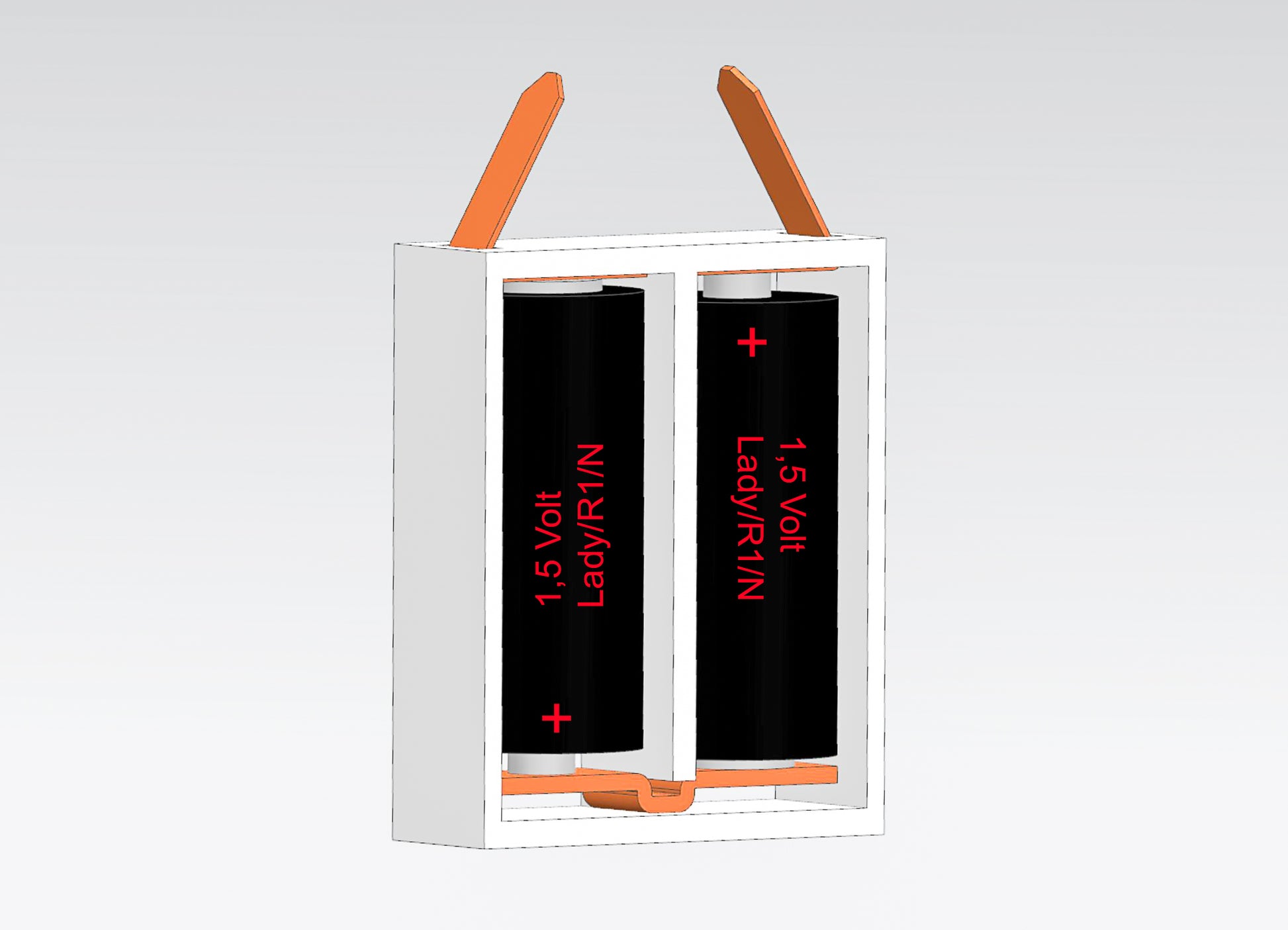 Zwei wechselbare 1,5 Volt Lady Batterien erzeugen 3 Volt um die Glühlampe und Glühwendel mit Strom zu versorgen